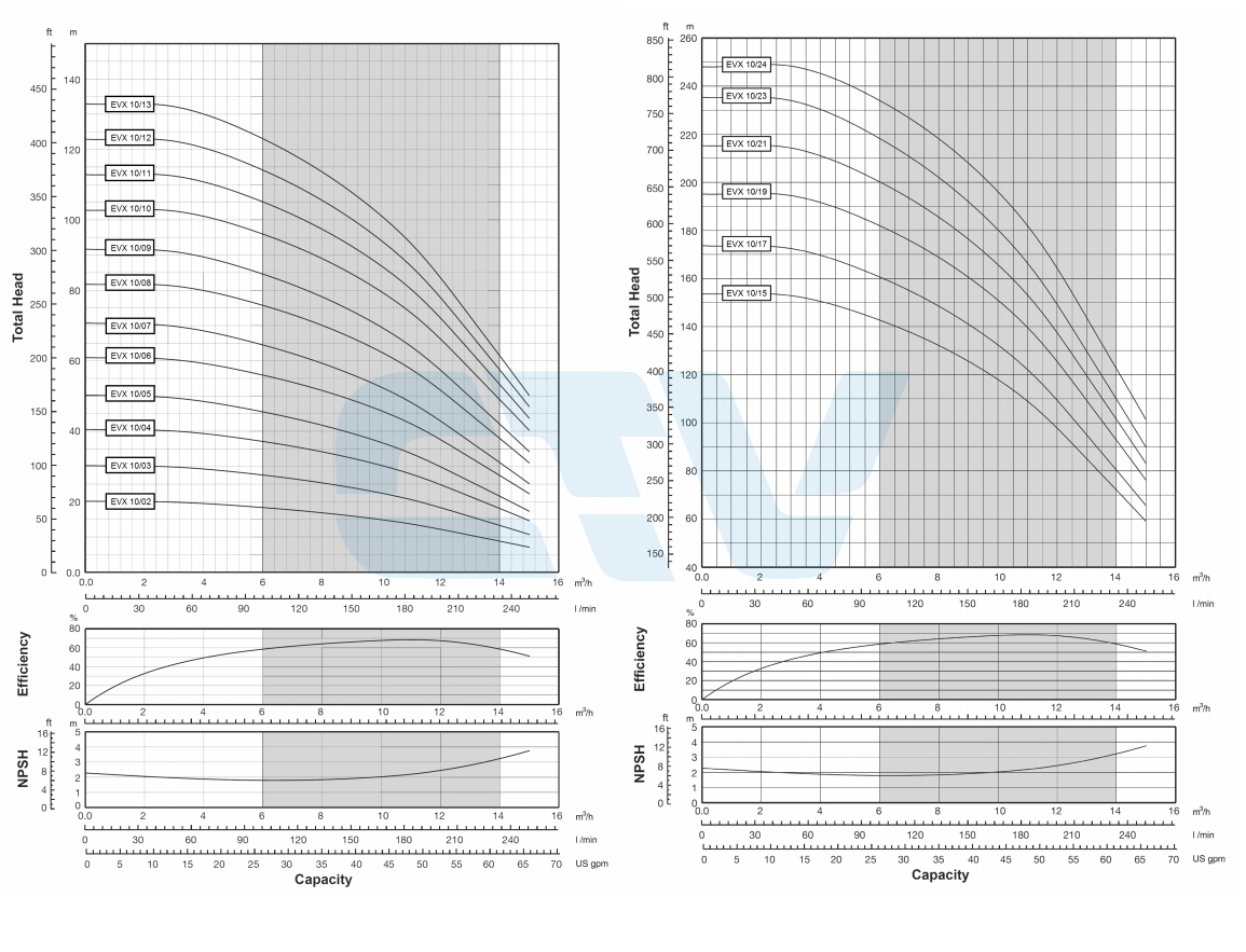 Bảng thể hiện lưu lượng, cột áp máy bơm trục đứng Stac EVX