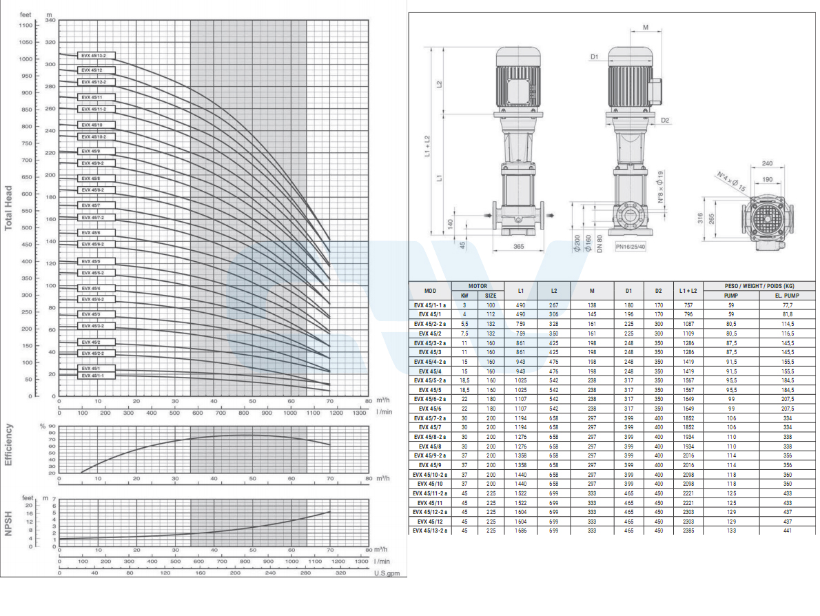 Bảng thể hiện lưu lượng, cột áp máy bơm trục đứng Stac EVX