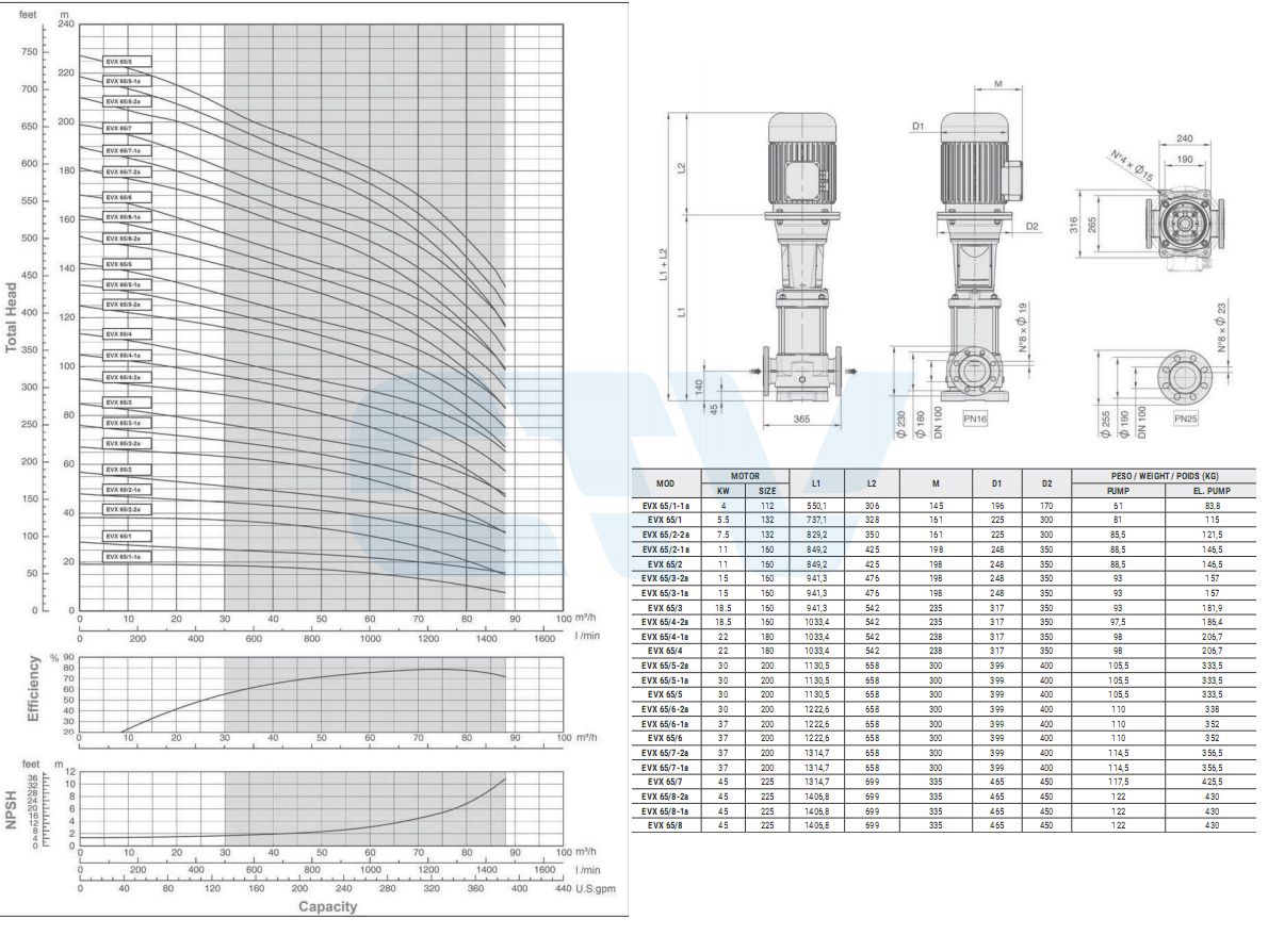 Bảng thể hiện lưu lượng, cột áp máy bơm trục đứng Stac EVX